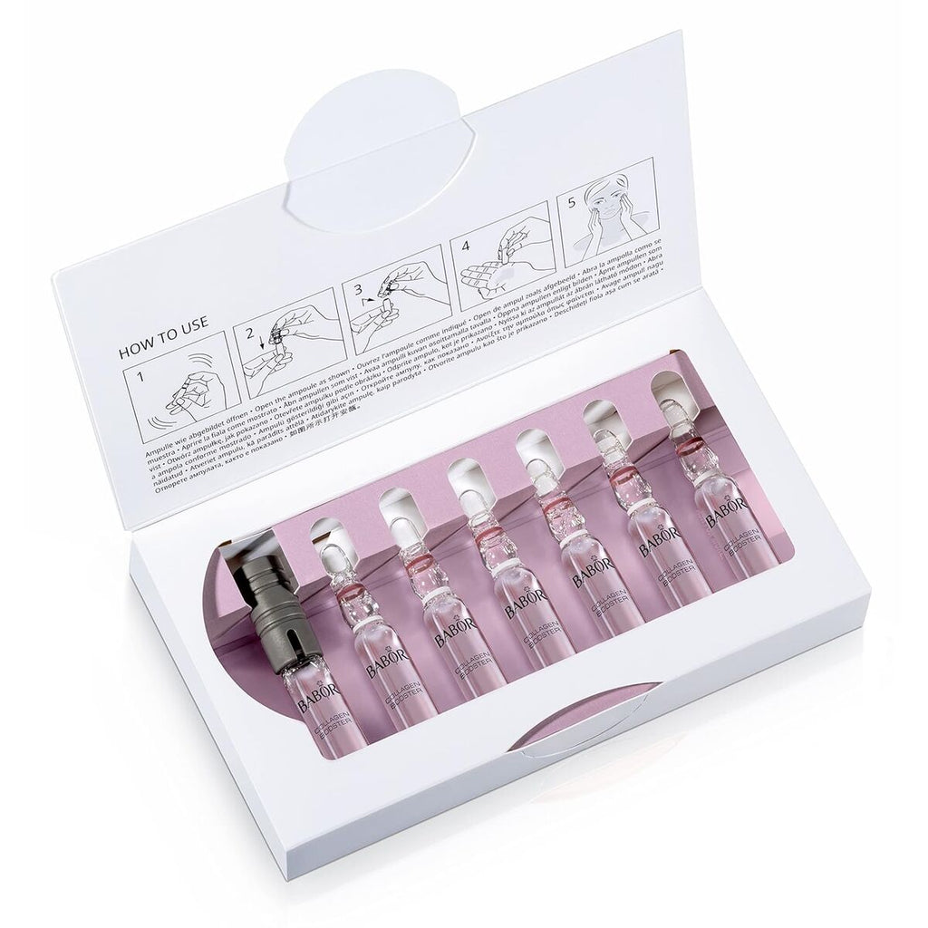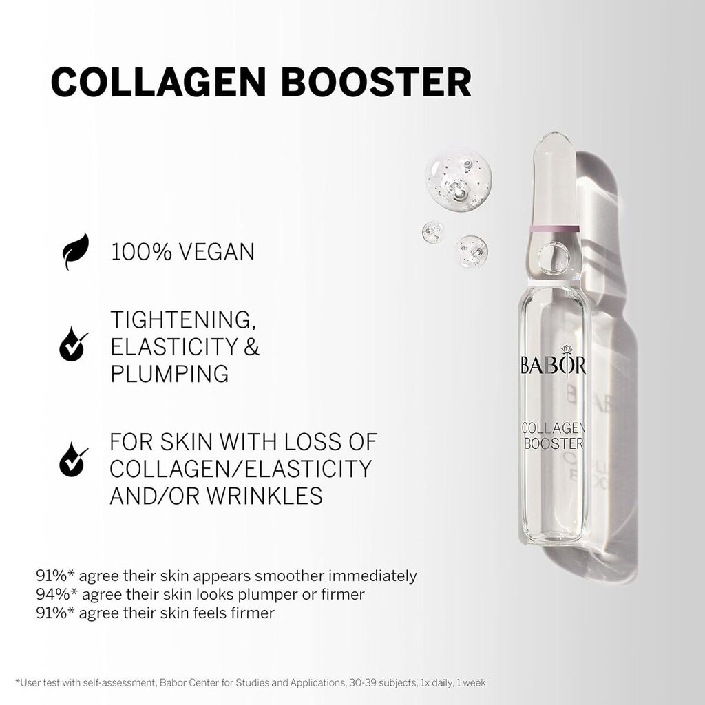 Collagen Booster fra Babor er en specifik behandling designet til at øge hudens naturlige kollagenproduktion, særligt formuleret til tør hud. Produktet kommer i en kompakt 2 ml emballage, ideel til præcis og kontrolleret påføring. Dets sammensætning indeholder konserveringsmidler som potassium sorbate, sodium benzoate, sodium hydroxide og sodium lactate, som sikrer produktets stabilitet og sikkerhed samtidig med effektiviteten. Formlen er velegnet til både mænd og kvinder, altså unisex, og følger en ansvarlig pleje filosofi, da den er vegansk. Fremstillet i Tyskland under høje kvalitets- og kontrolstandarder, hvilket sikrer en pålidelig behandling til synlig forbedring af elasticitet og fasthed i tør hud. Produktets tekstur og koncentration er udviklet til at optimere fugt og fremme en glattere hud, hvilket hjælper med at bekæmpe aldringstegn forbundet med kollagentab. Dette koncentrat kan indgå i specifikke ansigtsplejerutiner, der søger revitalisering og strukturel støtte til hudens bindevæv. Samlet set er Collagen Booster fra Babor et effektivt og videnskabeligt baseret supplement til anti-aging pleje, der forbedrer kvalitet og udseende af tør hud på en naturlig og ansvarlig måde.